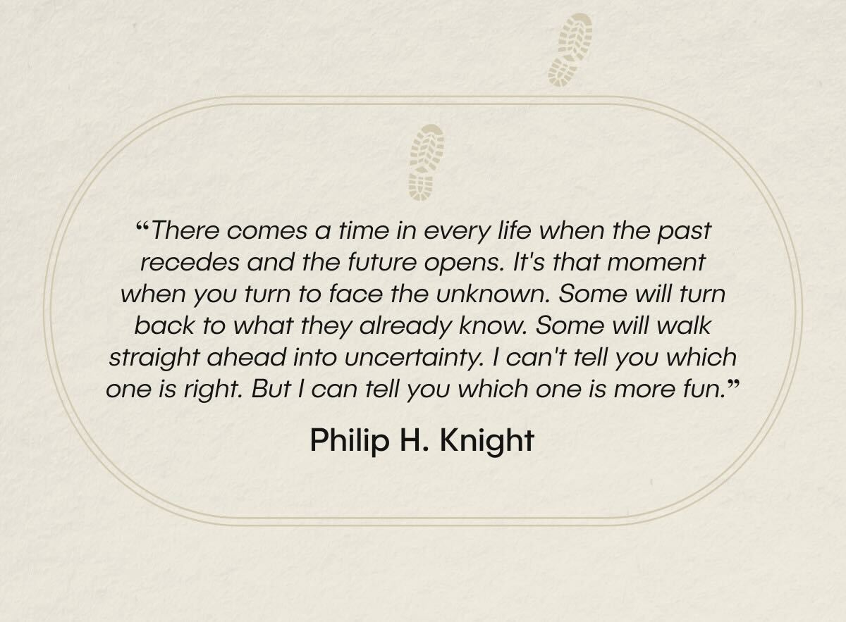 Over the past decade, we have often ended company emails with our favourite quote from Phil Knight (also imprinted on the grounds of the Stanford GSB campus):